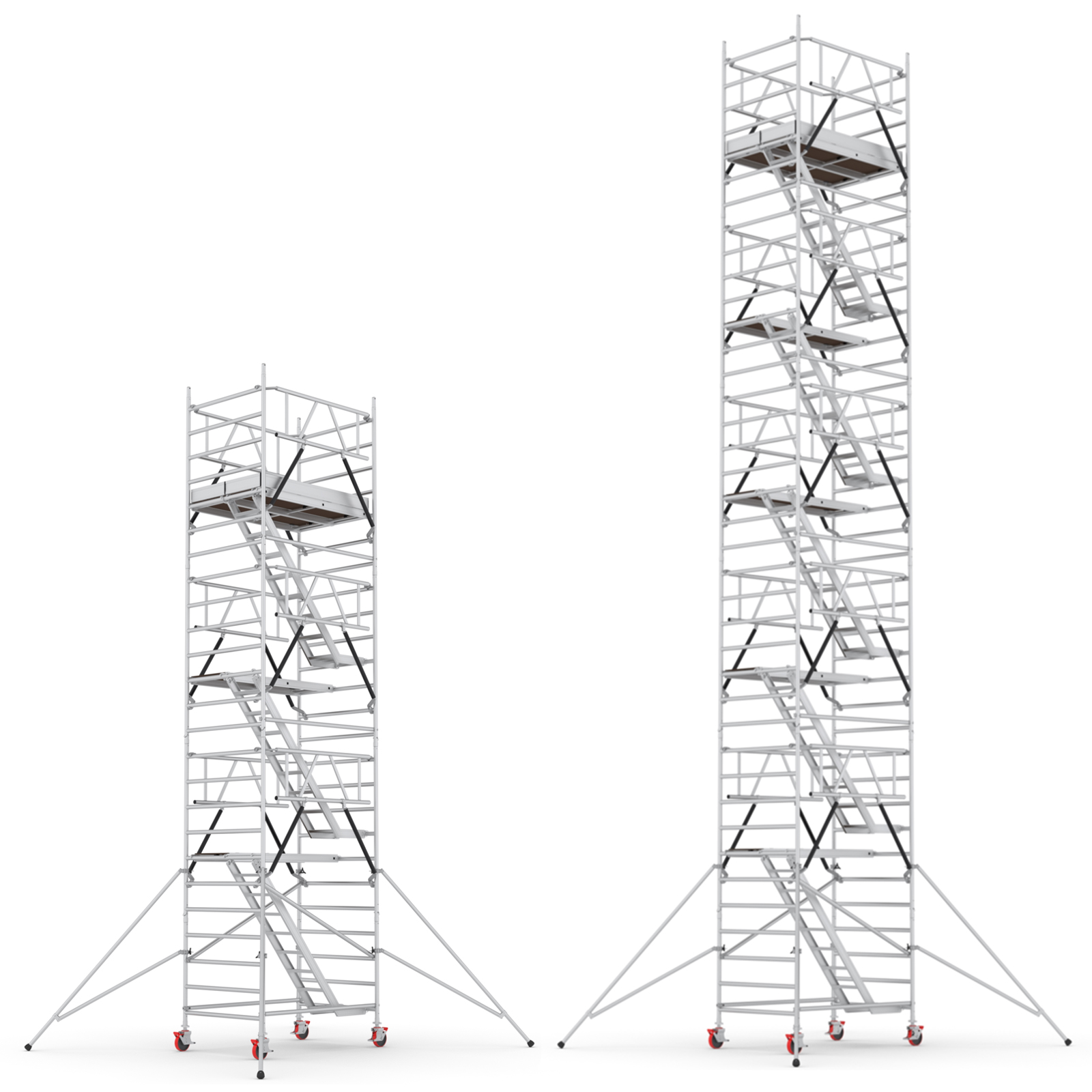 Die Pro 650 bietet eine Standhöhe von 6,51 m (Arbeitshöhe 8,51 m), die Pro 1070 sogar 10,72 m (Arbeitshöhe 12,72 m). Dank systemintegriertem, vorlaufendem Seitenschutz bist Du von Anfang an rundum gesichert. Höhenverstellbare Lenkrollen mit Feststellbremse erleichtern das Verschieben, während teleskopierbare Stabilisatoren sicheren Stand garantieren.