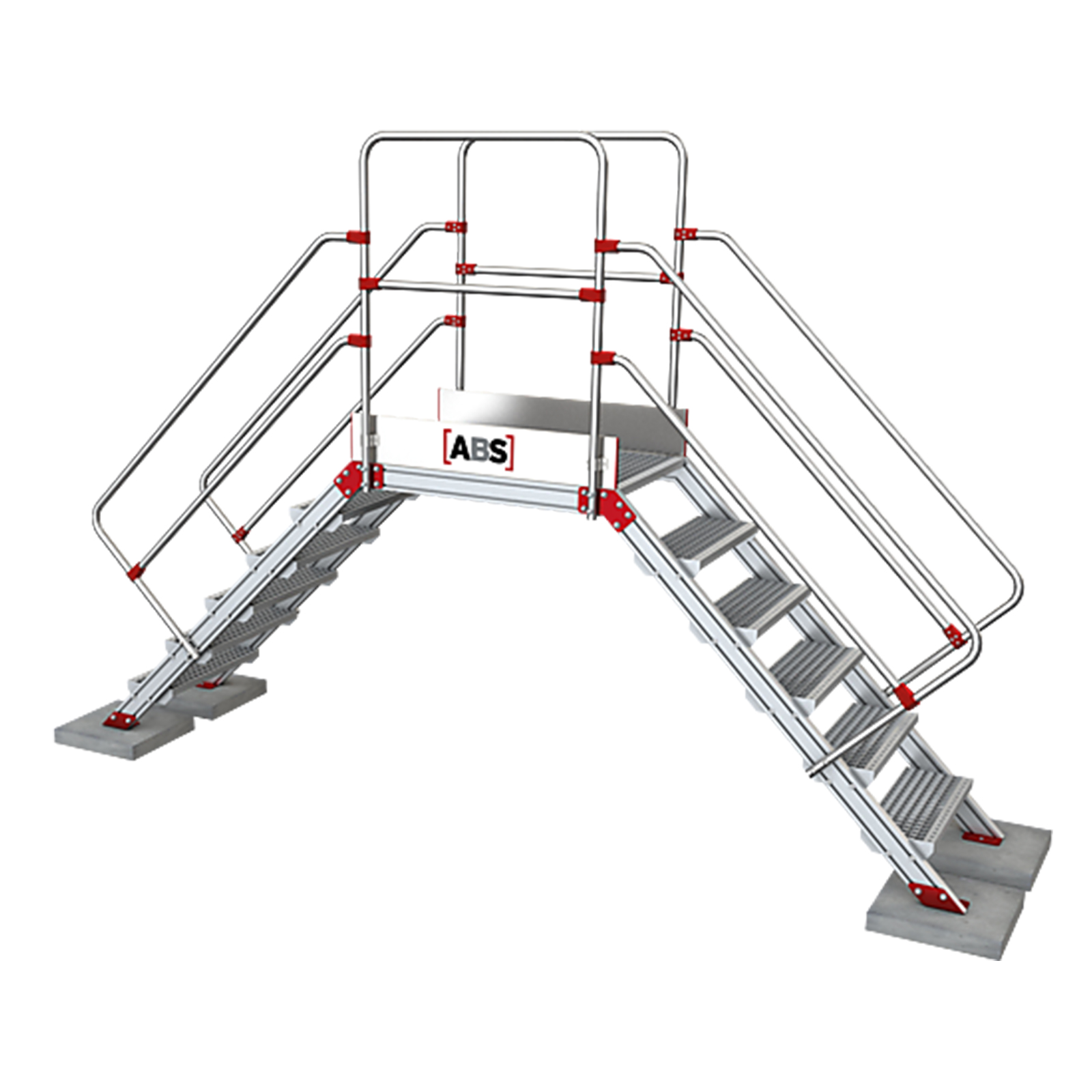 Mit dem ABS Überstieg werden Hindernisse und Stolperkanten auf flachen und leicht geneigten Dächern einfach überbrückt. Das System wird grundsätzlich mit Geländern/Handlauf auf beiden Seiten ausgeliefert und verfügt standardmäßig über Gitterroststufen und -podeste der höchsten Rutschhemmungsklasse (R 13).