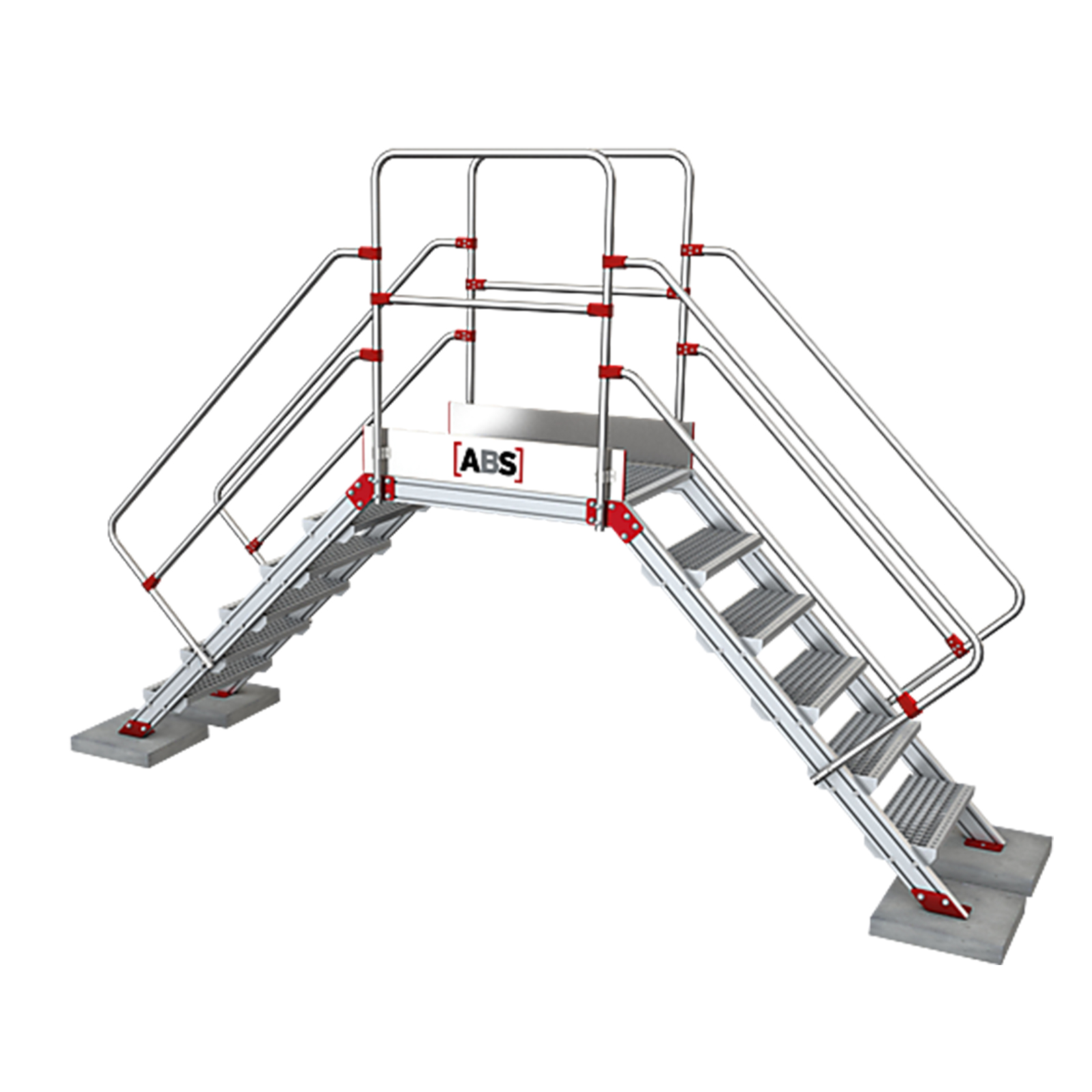 Weil ABS Überstiege auf einem Baukasten-System basieren, können Höhenunterschiede in einem Raster von jeweils 20 cm durch die Kombination verschiedener Elemente einfach ausgeglichen werden. Für ein Höchstmaß an Sicherheit verfügen die Tritte/Stufen und Podeste in allen Ausführungen über ein Aluminiumgitterrost der Rutschhemmungsklasse R 13. Sie sind damit trittsicher bis zu einem Neigungswinkel von mehr als 35°.