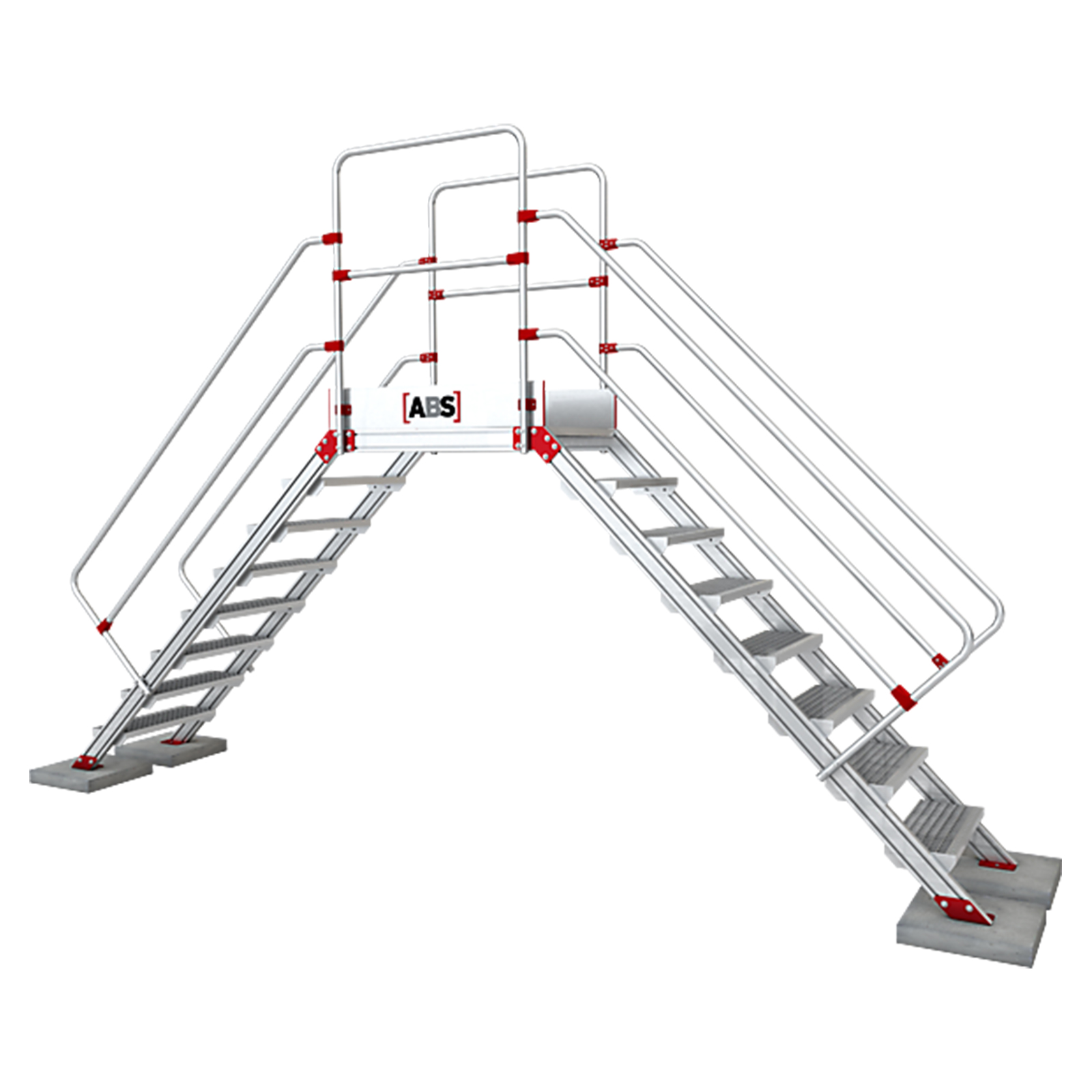 Mit dem ABS Überstieg werden Hindernisse und Stolperkanten auf flachen und leicht geneigten Dächern einfach überbrückt. Das System wird grundsätzlich mit Geländern/Handlauf auf beiden Seiten ausgeliefert und verfügt standardmäßig über Gitterroststufen und -podeste der höchsten Rutschhemmungsklasse (R 13).
