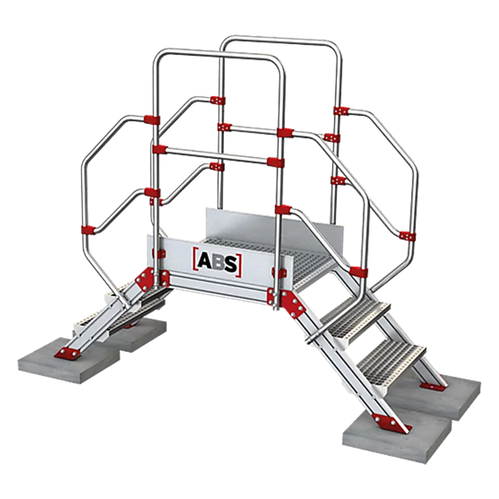 Mit dem ABS Überstieg werden Hindernisse und Stolperkanten auf flachen und leicht geneigten Dächern einfach überbrückt. Das System wird grundsätzlich mit Geländern/Handlauf auf beiden Seiten ausgeliefert und verfügt standardmäßig über Gitterroststufen und -podeste der höchsten Rutschhemmungsklasse (R 13).