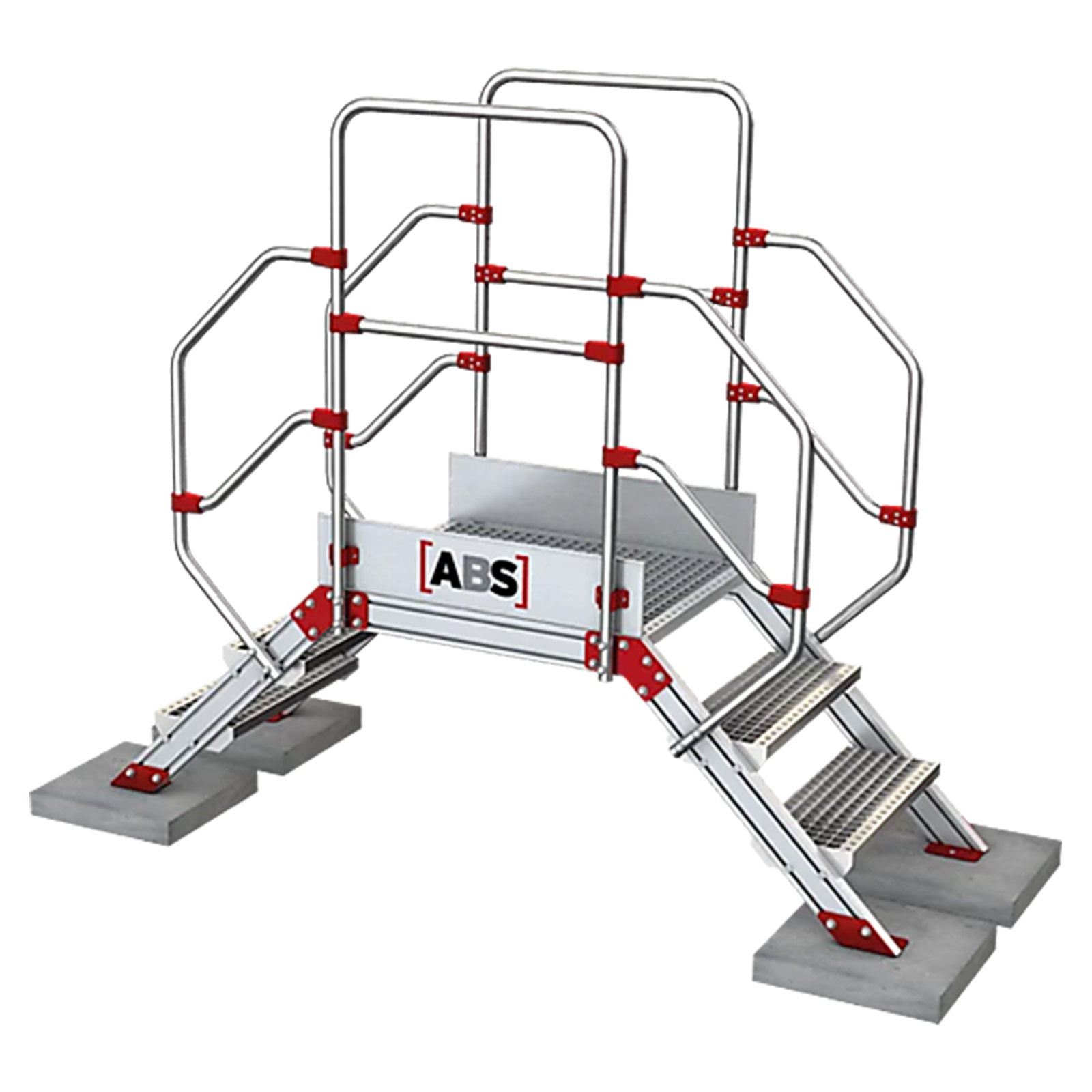 Mit dem ABS Überstieg werden Hindernisse und Stolperkanten auf flachen und leicht geneigten Dächern einfach überbrückt. Das System wird grundsätzlich mit Geländern/Handlauf auf beiden Seiten ausgeliefert und verfügt standardmäßig über Gitterroststufen und -podeste der höchsten Rutschhemmungsklasse (R 13).