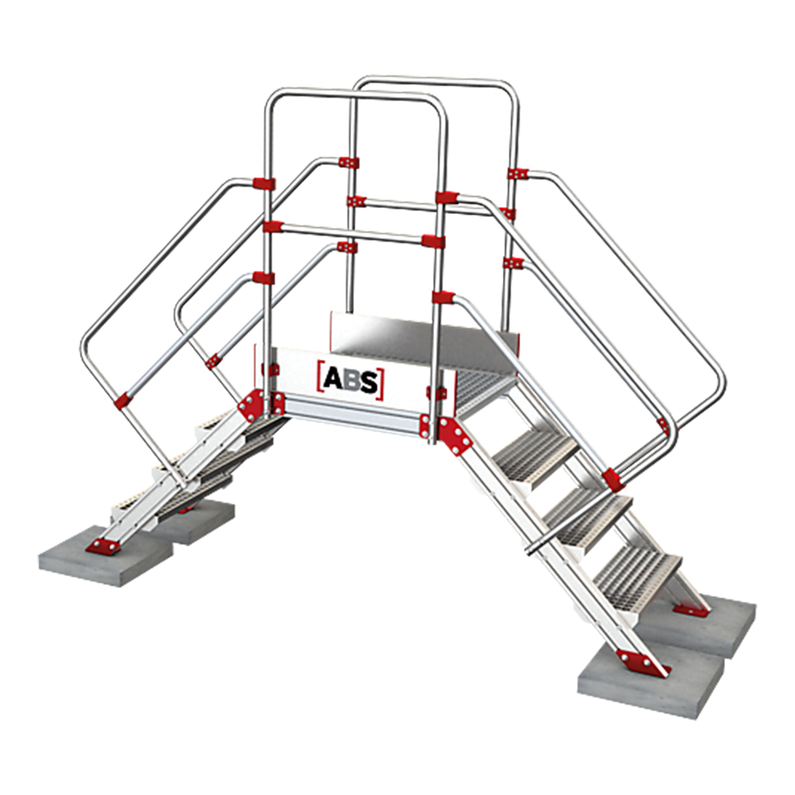 Mit dem ABS Überstieg werden Hindernisse und Stolperkanten auf flachen und leicht geneigten Dächern einfach überbrückt. Das System wird grundsätzlich mit Geländern/Handlauf auf beiden Seiten ausgeliefert und verfügt standardmäßig über Gitterroststufen und -podeste der höchsten Rutschhemmungsklasse (R 13).